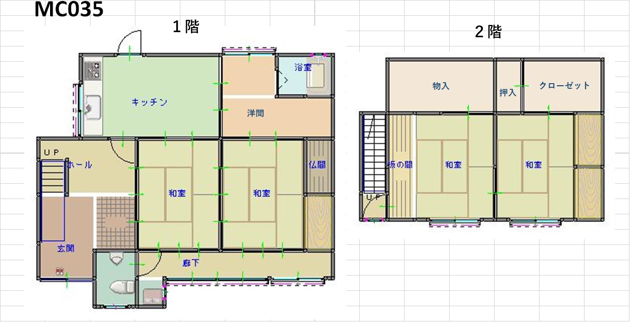 5DK 1階:和6/6、洋、キッチン、風呂、トイレ 2階:和6/6、クローゼット |